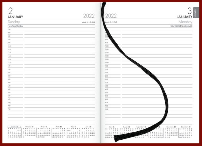 COLLINS DIARY A51A NAVY EVEN YEAR APPOINTMENT. A5 portrait. 1 day per page, 1/2 hour appointments 7.30am-7.30pm. Cash summary. Ribbon marker. Sewn, hardcover, book cloth cover.