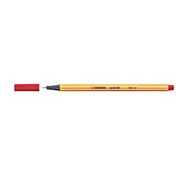 STABILO POINT PEN 88/40 FINELINER RED FINE FIBRE TIP . Europes number one fineliner pen! Metal enclosed tip for a long lifespan, strong fibre tip will not feather. Dry safe ink and long cap-off time. Line width 0.4mm is tidy and easy to read. Suitable for use with rulers and stencils. Ventilated cap for safety. Made in Germany. Assorted wallet of 6 contains red, violet, lilac, blue, green, and black. Single colours are sold in packs of 10.