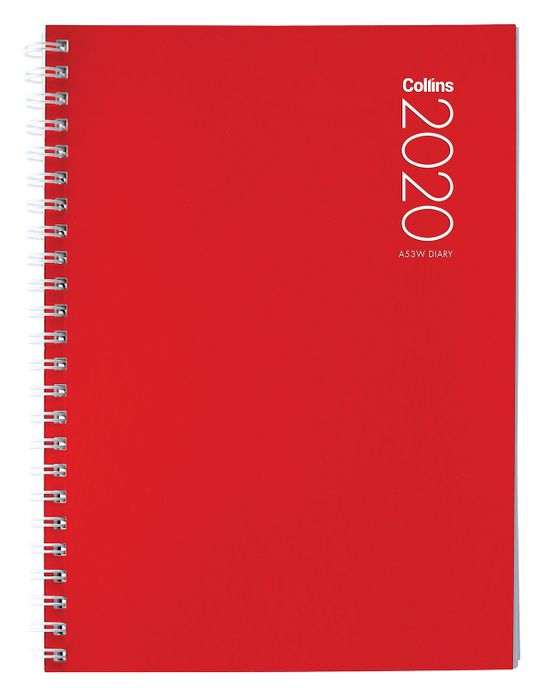 COLLINS DIARY A53W EVEN YEAR ASSORTED COLOURS . A5 portrait. 1 week per opening. Wiro bound, flexible, gloss art board cover. Supplied in any of four assorted colours - Black, Navy, Red, Green.