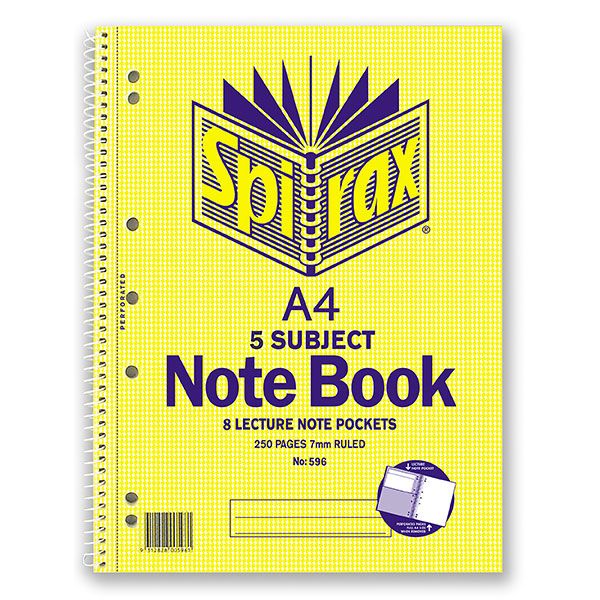 SPIRAX 596 5 SUBJECT NOTEBOOK A4 250 PG. 5 Subject A4 Book. 7mm Ruled Lines. 7 Hole Punched for use in 2,3 or 4 Ring Binders. Perforated Pages allow you to remove and file paper with ease. Includes 4 cardboard dividers that separate a group of pages. Red Ruled Margin included.