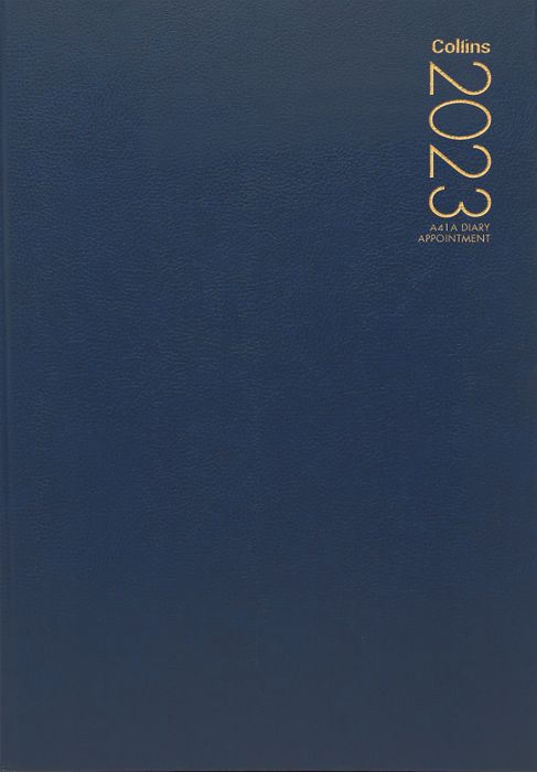 COLLINS DIARY A41A NAVY ODD YEAR APPOINTMENT 297 X 210MM. 1 day per page with quarter hour appointments from 7am until 7.45pm. It also has a full day for saturday and Sunday and a cash summary. book cloth hard cover and a ribbon marker.