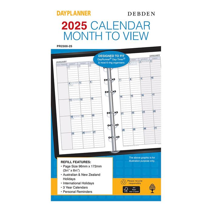 Debden Personal Dayplanner Refill 2025 Month to View Dayplanner provides a range of accessories and refills printed in two colours on quality white paper. All Debden Dayplanner refills are designed to fit comparable organisers on the market. Suitable for Debden Personal Dayplanner. 2025 Month to view refill.