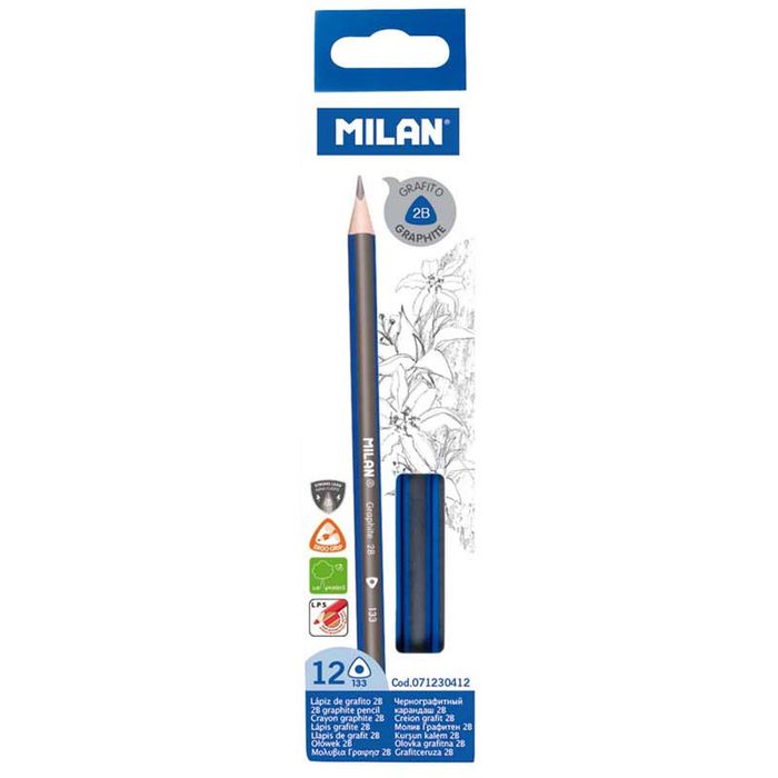 Milan Graphite Pencils 2b Pack 12 Triangular 2B pencils. Lead measures 2.4 mm. Ergonomic triangular shape. 2B leadis soft, making it ideal for artistic drawing. The lead creates a uniform stroke and is resistant to breakage due to its LPS (Lead Protection System) which strengthens the lead by sticking it to the wood. The wood is sourced from sustainable forests.