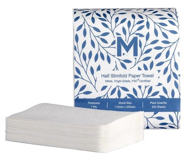 Half Slimfold Paper Towels Half slimfold towels are ideal for small hands and compact spaces where full sized towels are not suitable. Highly absorbent and durable, designed for use with the half slimfold dispenser. These towels are certified which ensures you are making a sustainable paper choice. Available in a 1 ply 200 sheet pack with an 1/3 fold sheet size of 115mm x 230mm.