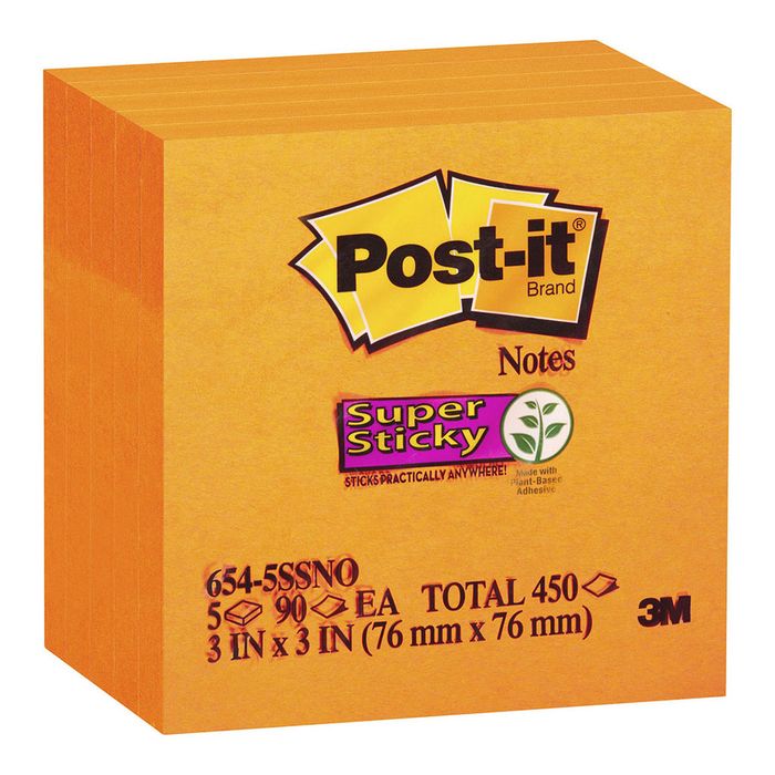 POST-IT SUPER STICKY NOTE 654-5SSNO ORANGE 76X76MM PKT/5. Post it Super Sticky Notes in 76x76mm feature 2x the sticking power. Use for notes or reminders on doors, windows or walls. Unique adhesive reliably sticks and re sticks so your message can stay front and center. Move your notes with you throughout the day. Neon Orange. 5 Pads/Pack, 90 Sheets/Pad.
