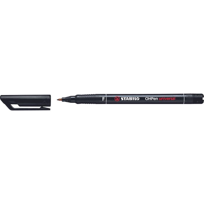 STABILO OHPEN UNIVERSAL OVERHEAD PROJECTOR PEN PERMANENT FINE BLACK. Writes on almost all smooth surfaces. Non-Slip grip zone and practical grip. Cap off time of up to 3 days. Ventilated cap. Permanent fine black.