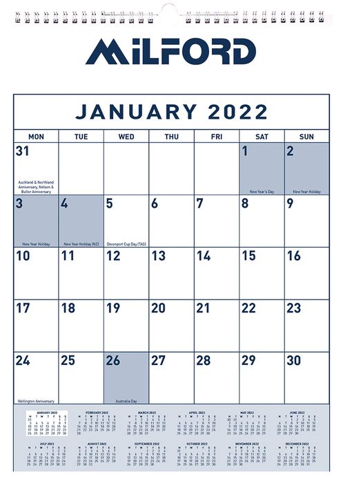 CALENDAR MILFORD ONE MONTH TO VIEW E/Y. Wall calendar Wiro bound at head, flexible. 295x422mm. 1 month to view.