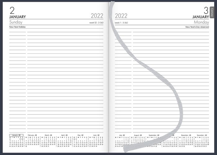 COLLINS DIARY A51E NAVY EVEN YEAR EXECUTIVE. A5 portrait. 1 day per page, full day Sat/Sun. Ribbon marker. Sewn, firm padded Italian PU material cover with edge stiching and gold metal corners. Black.