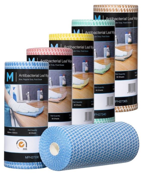Antibacterial Leaf Wipes Green, 300mm x 500mm, 90 Sheets, 60gsm Antibacterial leaf wipes are hygenic and highly absorbent. Dispensed on a perforated roll for convenience, they are reusable and machine washable. These wipes are made from a regular duty 60gsm, 70% viscose, 30% polyester mix. Available in five different colours to prevent cross contamination. available in 5 different colors blue, green, red, yellow, brown.