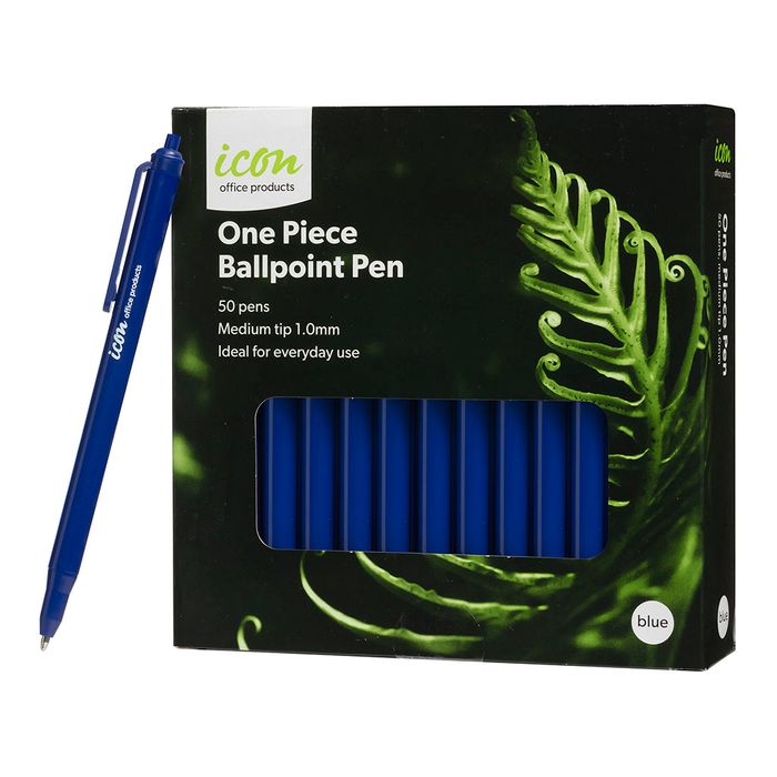 Icon One Piece Ballpoint Pen Blue, Pack of 50 Icon One Piece Ballpoint Pens are economical pens ideal for everyday use at work, home or school. They can not be pulled or twisted apart, making them safer for children to use. They have a high quality ink that is waterproof and fadeproof. The medium tip provides smooth ink flow to avoid scratching and blotting. Blue. 1.0mm Medium tip. Pack of 50.