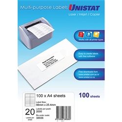 GENERAL USE LABEL UNISTAT DL20 LASER/INKJET/COPIER 20 UP 98 X 25.4MM BOX/100