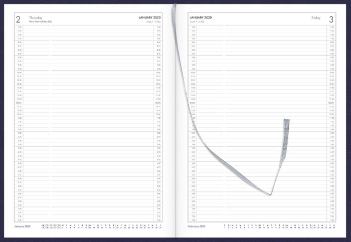 COLLINS DIARY A41A NAVY EVEN YEAR APPOINTMENT. A4 portrait. 1 day per page, full day Sat/Sun, 1/4 hour appointments 7am-7.45pm. Cash summary. Ribbon marker. Sewn, hardcover, book cloth cover.