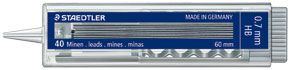 MARS MICRO PENCIL LEADS 255 HB 0.5MM STAEDTLER TUBE/40. Innovative push-button mechanism for single-handed use and refilling of individual leads. Funnel-shaped tip for easy refilling, lead content window. Unique ecological manufacturing process without PVC or softening agents. More than 90% natural raw materials. Suitable for use with all mechanical pencils. 40 leads per tube.