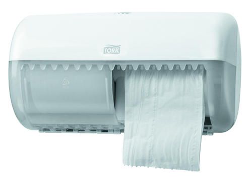 TOILET TISSUE DISPENSER TORK T4 WHITE. Tork T4 Conventional Toilet Tissue Dispenser White. Twin Roll. Low to medium capacity. Holds 2 conventional rolls horizontally. Dimensions WxDxH: 286x153x158mm . Fits toilet tissue rolls 2007866, 2185904, 400122 and 400125.