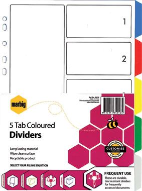 MARBIG DIVIDERS A4 PP 5 TAB COLOURED. Durable long lasting multi coloured dividers with blank tabs. Manufactured from recyclable polypropylene. Complete with a white table of contents page.