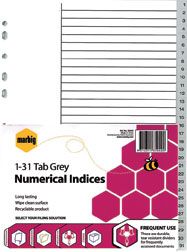 MARBIG INDICES A4 POLYPROP 1-31 GREY. Ideal for binders that are used regularly as the strong polypropylene allows files to be frequently accessed whilst maintaining appearance and they won't break or tear with constant use. Dividers are waterproof and can be wiped clean. Tabs are printed numerically for filing by month, week, date, day, etc and are available in grey or white. White PP Indices are also available in Extra Wide - 5 and 10 Tab - see Organisation Dividers - Extra Wide.