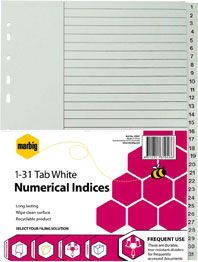 MARBIG INDICES A4 POLYPROP 1-31 WHITE . Ideal for binders that are used regularly as the strong polypropylene allows files to be frequently accessed whilst maintaining appearance and they won't break or tear with constant use. Dividers are waterproof and can be wiped clean.
