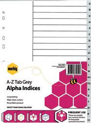 MARBIG INDICES A4 POLYPROP A-Z GREY. Ideal for binders that are used regularly as the strong polypropylene allows files to be frequently accessed whilst maintaining appearance and they won't break or tear with constant use. Dividers are waterproof and can be wiped clean. Tabs are printed numerically for filing by month, week, date, day, etc and are available in grey or white. White PP Indices are also available in Extra Wide - 5 and 10 Tab - see Organisation Dividers - Extra Wide.