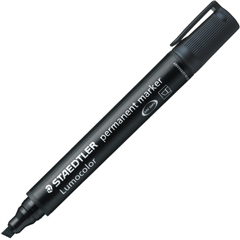 STAEDTLER MARKER PERMANENT 350 BLACK CHISEL TIP . Excellent smudge-proof and waterproof qualities on almost all surfaces. Dries in seconds, therefore ideal for left-handed users. Colour-intensive, low-odour. Lightfast (black and green for over 10 years on paper). Black and green are weatherproof.