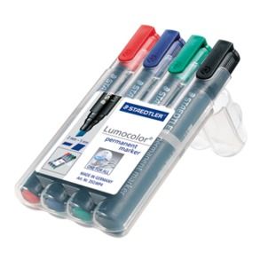 STAEDTLER MARKERS PERMANENT 350 PKT/4 ASSORTED CHISEL TIP . Excellent smudge-proof and waterproof qualities on almost all surfaces. Dries in seconds, therefore ideal for left-handed users. Colour-intensive, low-odour. Lightfast (black and green for over 10 years on paper). Black and green are weatherproof.