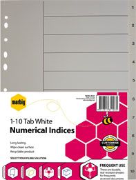 MARBIG INDICES A4 WHITE PP NUMBERED 1-10 . Ideal for binders that are used regularly as the strong polypropylene allows files to be frequently accessed whilst maintaining appearance and they won't break or tear with constant use. Dividers are waterproof and can be wiped clean. Tabs are printed numerically for filing by month, week, date, day, etc and are available in grey or white. White PP Indices are also available in Extra Wide - 5 and 10 Tab - see Organisation Dividers - Extra Wide.