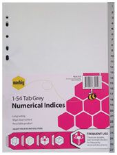 INDICES MARBIG GREY A4 1-54 PP. Ideal for binders that are used regularly as the strong polypropylene allows files to be frequently accessed whilst maintaining appearance and they won't break or tear with constant use. Dividers are waterproof and can be wiped clean. Tabs are printed numerically for filing by month, week, date, day, etc and are available in grey or white. White PP Indices are also available in Extra Wide - 5 and 10 Tab - see Organisation Dividers - Extra Wide.