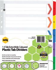 MARBIG EXTRA WIDE DIVIDERS A4 PP 5TAB. Extra Wide Dividers are 240mm wide and are designed for use with sheet protectors as the tabs extend beyond the edge of the pocket. Available in various materials and colours.
