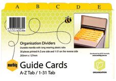 MARBIG GUIDE CARDS A-Z/1-31 8X5"MM 127 X 203MM. Manilla guide cards with plastic tabs. Tabs are printed A-Z on one side and 1-31 on the other so filing can be done alphabetically or by date. Tabs are made of plastic for durability and long life, standing up to frequent use. Packs contain 30 cards. Fits the 45877 card box.