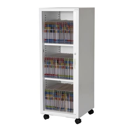 TAMBOUR CABINET MOBILE VERDE TORETTA. The Verde Torretta is a slim profile office storage cabinet with wheels, designed for ease of movement and minimising floor space. Dimensions: 1200H x 450W x 450D mm. Internal: 1065H x 350W x 405D mm. Fully Powder coated Case with Sliding Tambour Door. Front Castors Locking. Lockable Tambour Door. Complete with 2 Shelves for 3 Levels of A4 Storage. Delivered Assembled. Available in Standard Powder coat and Tambour Door Colours. Lifetime Warranty.