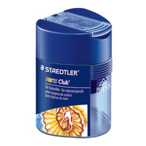 NORIS CLUB PENCIL SHARPENER DOUBLE HOLE WITH BARREL STAEDTLER . Two holes for different pencils (see item description for details per sharpener). For standard-sized blacklead pencils up to 8.2 mm with a sharpening angle of 23° for clear and accurate lines. For standard-sized coloured pencils up to 8.2 mm with a sharpening angle of 30 ° for broad, soft lines. For thick blacklead and coloured pencils up to 10.2 mm with a sharpening angle of 30° for broad, soft lines. Metal sharpener insert. Hinged cover prevents shavings from spilling.