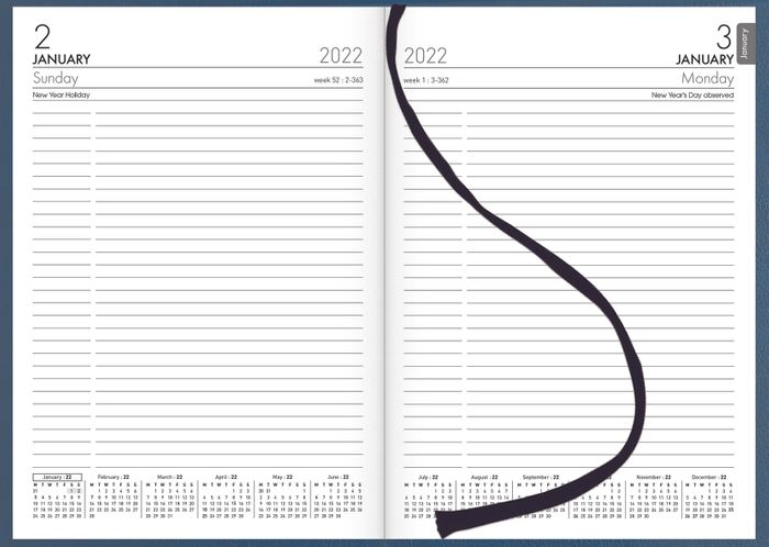 COLLINS DIARY A51 NAVY EVEN YEAR. A5 portrait. 1 day per page, full day Sat/Sun. Ribbon marker. Sewn, hardcover, book cloth cover.