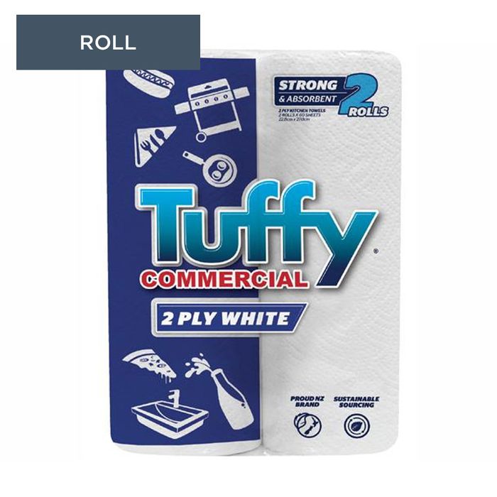 TUFFY KITCHEN PAPER TOWEL TWIN PACK WHITE. A hardworking commercial paper towel, ultra strong due to its unique QUAD-WEAVE TECHNOLOGY and the thick, 2 ply dual textured paper, Tuffy has proven strength and absorbency. Ideal to quickly and easily clean up and remove all the little messes around your workplace. Makes an easy placemat or serviette. 60 Sheets per roll. All Tuffy Paper Towels products are biodegradable. Recyclable plastic wrapper and cardboard centre. Tuffy Paper Towels are proudly New Zealand made from local and imported materials.