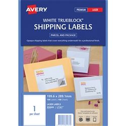AVERY LASER LABELS L7167 1UP PK/100. White TrueBlock Shipping Labels, L7167, 100/Pack, 199.6 x 289.1 mm. TrueBlock technology means the labels completely cover old text and labels. Ideal for regular shipping of large packages and boxes. Label over existing information and re-use boxes, parcels and tubes. Supported by free Avery software available at averyproducts.com.au FSC certified labels made with paper from well-managed forests. Permanent adhesive. Paper material. 100 sheets per pack. 1 label per page. 100 labels per pack. Avery code 959009.