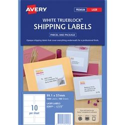 AVERY LASER LABEL L7173 10 UP PKT/100. White TrueBlock Parcel Labels, L7173, 99.1 x 57 mm. TrueBlock technology means the labels are completely opaque, covering old text and labels. Label over existing information and re-use packaging materials. Ideal for sending envelopes, mailing tubes and smaller boxes. Design your labels using free Avery software. FSC certified labels made with paper from well-managed forests. Permanent adhesive. Paper material. 100 sheets per pack. 10 labels per page. 1000 labels per pack. Avery code 959031.