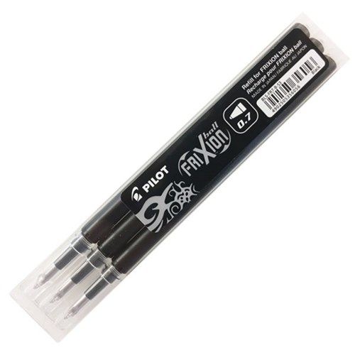 PILOT FRIXION PEN REFILLS 0.7 BLACK 3PK. This Pilot FriXion Pen Refill pack is used with the Pilot FriXion Pens. When the refill is used in conjunction with the FriXion pen the eraser stud allows you to write, remove and rewrite with just one easy to use a writing utensil. Can be used in both capped and retractable Frixion pens - See codes 20059 and 20064.