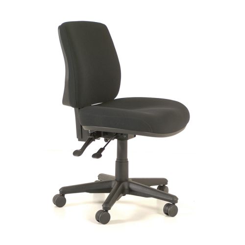 CHAIR BURO ROMA MIDBACK 2 LEVER BLACK. The Roma 2 lever chairs exceptionally comfortable seat and supportive back more than match its modern good looks. Its many seat and back position adjustments enable the user the ultimate office seating experience.. FRDI certified 130 x 48mm gas lift. Ratchet height adjustable back/lumbar.. Adjustable seat and backrest angle - free floating or lockable. AFRDI certified polyurethane moulded foam. AFRDI certified D1 Black nylon base. AFRDI certified 60mm twin wheel castors. Medium back.. Supported by the internationally recognised Global GreenTagCert. Indicative user weight rating: 140kg. Indicative daily sitting hours: 8+. 10 Year Guarantee. Overall size: 630(W) x 1120(H) x 600(D)mm.. Back size: 430(W) x 445(H)mm. Seat size: 520(W) x 490(D)mm. Seat height: 460-590mm. Upholstered in Black Jett Fabric. No Arms.