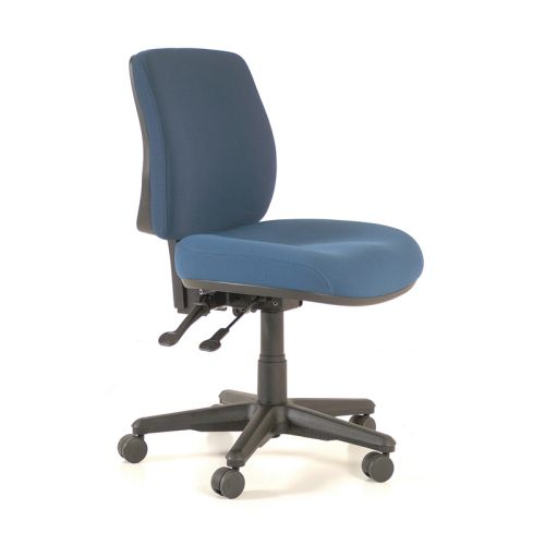 CHAIR BURO ROMA MIDBACK 2 LEVER NAVY. The Roma 2 lever chairs exceptionally comfortable seat and supportive back more than match its modern good looks. Its many seat and back position adjustments enable the user the ultimate office seating experience.. FRDI certified 130 x 48mm gas lift. Ratchet height adjustable back/lumbar.. Adjustable seat and backrest angle - free floating or lockable. AFRDI certified polyurethane moulded foam. AFRDI certified D1 Black nylon base. AFRDI certified 60mm twin wheel castors. Medium back.. Supported by the internationally recognised Global GreenTagCert. Indicative user weight rating: 140kg. Indicative daily sitting hours: 8+. 10 Year Guarantee. Overall size: 630(W) x 1120(H) x 600(D)mm.. Back size: 430(W) x 445(H)mm. Seat size: 520(W) x 490(D)mm. Seat height: 460-590mm. Upholstered in Navy Jett Fabric. No Arms.