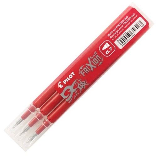 PILOT FRIXION PEN REFILLS 0.7 RED 3PK. This Pilot FriXion Pen Refill pack is used with the Pilot FriXion Pens. When the refill is used in conjunction with the FriXion pen the eraser stud allows you to write, remove and rewrite with just one easy to use a writing utensil. Can be used in both capped and retractable/clicker Frixion pens.