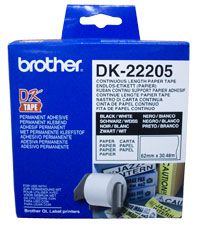 LABEL PRINTER LABEL P-TOUCH DK22205 BROTHER CONTINUOUS PAPER. This white 62mm x 30.48m continuous length paper label tape is suitable for use with our QL500W, QL700, QL720NW, QL580N, QL650TD and QL1050 label printers. Brothers DK tapes are a variety of convenient, pre-cut labels. They come in different shapes and sizes commonly used for mailing and administrative applications. DK tapes can be used with all QL label printers: QL500W, QL700, QL720NW, QL580N, QL650TD and QL1050.
