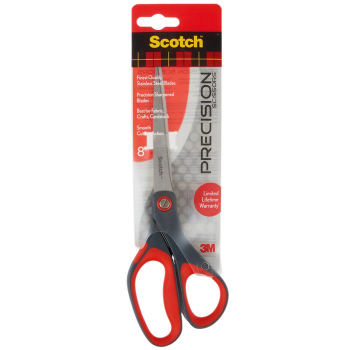 SCISSORS SCOTCH 1448 PRECISION 8IN GREY/RED . Professional quality scissors, great for fabrics, heavyweight paper and photos. Finest quality stainless steel blades for a sharp edge and long cutting life. Smooth cutting action for performance. Precision-sharpened blades. Limited lifetime warranty.