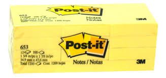 POST IT NOTES 653 YELLOW PKT/12 34.9X47.6MM 653-12. Self stick non-marking repositionable notes, low tack adhesive allows sticking to most surfaces. 100 sheets per pad. Sold in packs of 12 pads.
