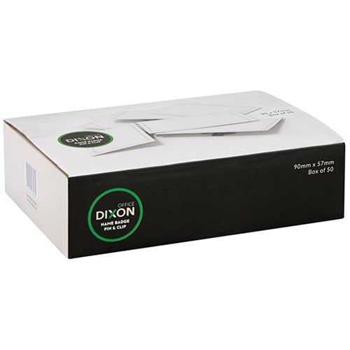 DIXON NAME BADGE PIN AND CLIP. Made from clear, rigid plastic, these name tag holders will suit most standard business cards and computer generated labels and name badges. In landscape format W90 x L57mm with combination pin and clip for versatility. Includes white card inserts. Sold in singles and boxed in 50' s.