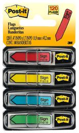 FLAGS MESSAGE SIGN HERE ARROW 684-SH POST-IT . Direct attention and request action quickly and easily with Post-it Message Flags. Sticks securely, removes cleanly without lifting ink or damaging important documents. Includes 30 flags in each colour: yellow, blue, red and green. 120 flags per pack. W11.9mm x L43.2mm.
