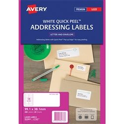 AVERY LASER LABELS L7163 QP 14 UP PKT/20. White Address Paper Labels with Quick Peel Pop-up Edge, L7163, 280/Pack, 99.1 x 38.1 mm. New Quick Peel Pop-up Edge allows for quicker and easier detachment of labels from backing sheet. High quality printing with no toner flaking. Special permanent adhesive withstands the high heat of laser printers. FSC- Certified labels made with paper from well-managed forests. 20 sheets per pack, 14 labels per page, 280 labels per pack. Avery code 952003.