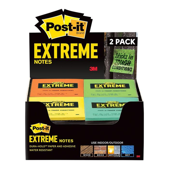 Post-it Extreme Notes 76x76mm Assorted Pack of 2. When conditions make communication tough, Post it Extreme Notes make leaving notes and reminders simple, so you can get the work done. Made with Dura Hold Paper and Adhesive, these notes will hold up in hot, cold and wet conditions. They stick to tough and textured surfaces like concrete, raw and painted wood, and tile (not recommended for use on paper). Make sure your message is seen with a note that sticks in tough conditions. Removes cleanly. This pack includes 2 pads of Post it Extreme Notes 76mmx76mm. Each pad has 45 sheets. Assorted colours.