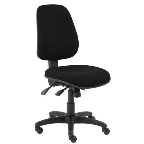 CHAIR CHORUS 3.50 3 LEVER HIGH BACK BLACK FABRIC. The Chorus 3.50 Operator Chair has a classic design which includes lumbar and upper back support and a contoured seat. The 3 lever mechanism allows the user to adjust seat height, seat angle and back angle, giving the user a custom seating position. The nylon star base has castors, allowing the user freedom or movement and this chair is suitable for users weighing up to 140kg. 10 year warranty. A 3 lever office chair that gives the user a custom seating position. Adjustable back angle, seat angle and seat height. Castors for easy mobility. Durable black Quantum fabric upholstery. Seat Dimensions: 480x490 (wxd). Back Height: 470mm. Supplied assembled.