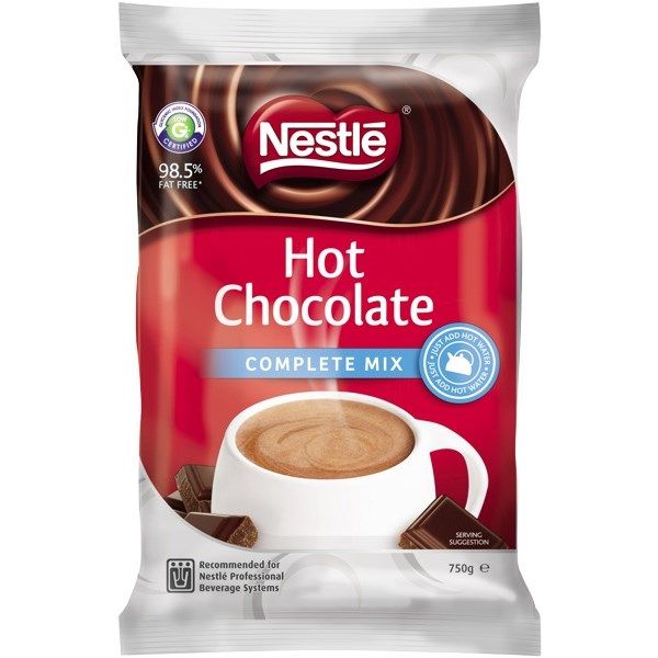 NESTLE HOT CHOCOLATE VENDING 750GM SOFT PACK COMPLETE MIX. NESTLÉ Hot Chocolate Complete Mix is a fine, brown powder made from a blend of fine cocoa and skim milk powder. It has been specially formulated for use in vending and automatic dispensing machines fitted with a whipper to create a creamy chocolate drink. 98.5% fat free*. Low GI (51). * when prepared according to directions. The GI is a ranking of carbohydrates according to their effect on blood glucose levels. 40 cups per pack approx.